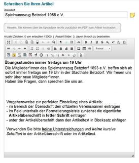 Ergänzender Hinweis: In letzter Zeit ist es immer wieder vorgekommen, dass in die Datenbank eingestellte Artikel, nicht mit einer Überschrift versehen wurden. Als Überschrift gemeint ist, wie aus der beigefügten Grafik zu erkennen, die Zeile „Übungsstunden immer freitags um 19 Uhr“.