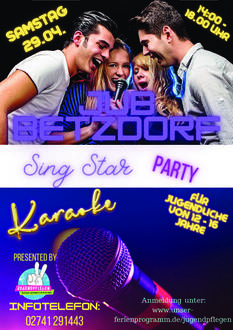 Du bist zwischen 12 und 16 Jahren und hast Spaß am Singen und möchtest dich dabei mit anderen batteln? Dann ist die Singstar-Party genau das richtige für dich. Am Samstag, dem 29.04.2023 von 14 bis 18 Uhr hast du die Möglichkeit im JUB (Viktoriastraße 25) in Betzdorf das Mikro in die Hand zu nehmen und dein Können unter Beweis zu stellen. Und selbst wenn ein paar schiefe Töne dabei sind - Der Spaß steht hier im Vordergrund! Anmelden kannst du dich über: www.unser-ferienprogramm.de/jugendpflegen