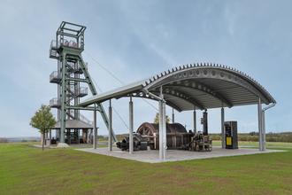 Der „neue“ Barbaraturm: Die Anlage auf der Steineberger Höhe zwischen Steinebach/Sieg und Malberg wurde um die Original-Fördermaschine in einem offenen Maschinenhaus zu einer vollständigen Schachtförderanlage ergänzt.