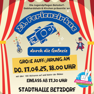 Fünf Tage trainieren über 70 Kinder im Alter von 9 - 14 Jahren über 30 Helfer/innen in der Stadthalle Betzdorf und erarbeiten gemeinsam ein spektakuläres Programm. In 14 verschiedenen Workshops. Unter der Anleitung von Betreuer/innen, werden die unterschiedlichsten Zirkustechniken ausprobiert und einstudiert. Von Akrobatik bis Zaubern über Hip Hop tanzen bis zum Einrad fahren wird es auf der Bühne ein Feuerwerk der Attraktionen geben. Die Jugendpflegen Betzdorf-Gebhardshain und Kirchen wünschen viel Spaß bei der Aufführung.