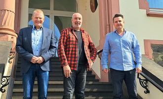 Bürgermeister Bernd Brato (li.) und Stadtbürgermeister Benjamin Geldetzer (re.) verabschiedeten den Hausmeister der Stadthalle, Jörg Stunk (Mitte), in den Ruhestand.