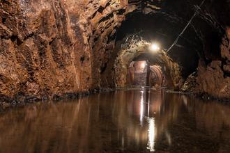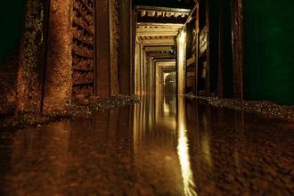 Die schwache Stollenbeleuchtung spiegelt sich anmutig im Wasser. Das Bergwerksteam hofft, dass das Wasser jetzt endlich abläuft und nach der Schlammbeseitigung die Saison beginnen kann.