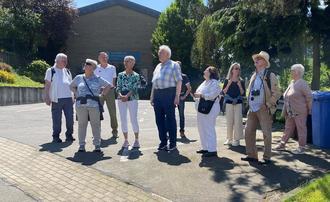Die kurze Runde endete im Ev. Gemeindehaus, wo Ulrich Meyer einiges zur Geschichte der Ev. Kirche erzählte. In der Kirche selbst fanden Aufbaumaßnahmen für ein Konzert statt, weshalb unsere Gruppe dort nicht hineinkonnte. Meyer verstand es jedoch, so anschaulich zu erzählen, dass man meinte, sich gerade im Kirchenschiff zu befinden.