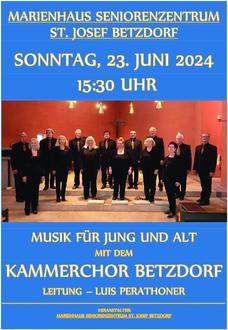 Unter dieser Überschrift findet am Sonntag, 23. Juni 2024, im Marienhaus Seniorenzentrum St. Josef Betzdorf ein Konzert des Kammerchores Betzdorf statt.