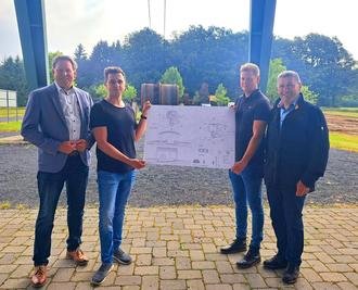 Präsentieren die Pläne für die neue Einhausung am Barbaraturm (v.l.n.r.): Der Erste Beigeordnete Joachim Brenner, Josua Straka (Architekt Bauamt), Tim Schumacher (stellv. Bauamtsleiter) und der Ortsbürgermeister von Malberg Albert Hüsch.