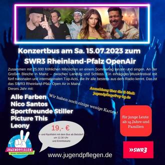 Am Samstag, 15. Juli 2023, findet das SWR3 Rheinland-Pfalz OpenAir in Mainz statt. Zusammen mit 25.000 fröhlichen Menschen an einem Sommertag tanzen und singen. An der Großen Bleiche in Mainz möglich - zwischen Landtag und Schloss findet das SWR3 Rheinland-Pfalz OpenAir statt. Ein eintägiges Musikfestival mit fünf nationalen und internationalen Top-Acts, die ihr alle bestens aus dem Radio kennt. Dieses Jahr mit dabei sind: Alle Farben, Nico Santos, Sportfreunde Stiller, Picture This und Leony.