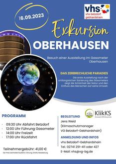 Erleben Sie ein paar spannende Stunden im Gasometer Oberhausen. Wir starten um 9:30 Uhr mit dem Bus ab Betzdorf und machen uns auf den Weg zu einem der beeindruckendsten Industriedenkmäler Deutschlands. Dort erwartet uns die faszinierende Ausstellung "Das zerbrechliche Paradies", die Sie mit auf eine bildgewaltige Reise durch die bewegte Klimageschichte unserer Erde nimmt. Die Führung beginnt um 12:00 Uhr und dauert ca. 60 min. Nach der Führung haben Sie genügend Zeit, um die Ausstellung bzw. den Gasometer auf eigene Faust zu erkunden. Bitte beachten Sie, dass die Temperatur im Gasometer der jeweiligen Außentemperatur entspricht. Wir empfehlen Ihnen daher, sich entsprechend zu kleiden.