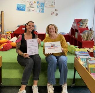 Das Foto zeigt Svenja Nickolai von der Evangelischen KiTa Kirchen und Dorothee Stöcker-Michael von der Ökumenischen Stadtbücherei Betzdorf bei der Überreichung des Zertifikats "Bildungspartner Bibliothek und KiTa".