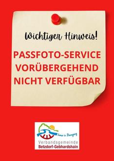 Aufgrund einer technischen Störung bei der Bundesdruckerei ist die Anfertigung von Passfotos im Rathaus Betzdorf der Verbandsgemeinde Betzdorf-Gebhardshain derzeit leider nicht möglich.