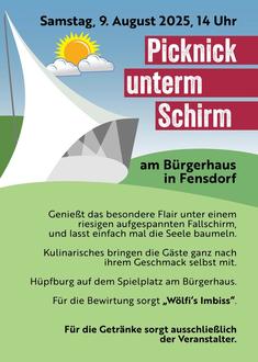 Am Samstag, dem 9. August 2025 werden ab 14:00 Uhr am Bürgerhaus in Fensdorf unter einem großen Fallschirm unter dem Namen „Picknick unterm Schirm“ gemeinsam ein paar schöne Stunden verbracht. Im Vergleich zu den Vorjahren hat sich allerdings nicht nur der Name geändert, sondern auch das Konzept wurde angepasst. Weiterhin wird die Veranstaltung von der Ortsgemeinde, der DJK und dem Fensdorfer Karnevals Club organisiert. Geblieben ist, dass für die Gäste Tische bereitstehen, diese müssen aber nicht mit einem Motto dekoriert oder passende Kleidung getragen werden, es kann aber natürlich weiterhin gemacht werden. Anmeldungen sind nicht erforderlich und die Prämierung des am schönsten dekorierten Tisches entfällt. Speisen kann jeder immer noch selbst mitbringen, für die Getränke sind allerdings ausschließlich die Veranstalter zuständig. Für weitere Verpflegung sorgt „Wölfi’s Imbiss“, für die kleinen Gäste steht eine Hüpfburg bereit. Der Eintritt ist frei. „Rock unterm Schirm“ entfällt aufgrund des im April stattgefundenen Konzerts der Band „Damn It“ im Bürgerhaus, welches auch nächstes Jahr veranstaltet werden soll.