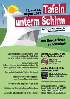 Bei schlechtem Wetter findet die Samstagabendveranstaltung im Bürgerhaus statt. Das „Tafeln unterm Schirm“ am Sonntag findet nur bei trockener Witterung statt. Bei einer Absage werden die angemeldeten Gruppen informiert.