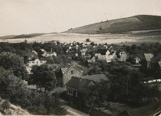 Dahinter wird der Blick frei auf die Struth und die Abhänge des Arsberg, der sich auf dem Foto noch völlig unbebaut gibt. Auf der unteren Terrasse wird fleißig Landwirtschaft betrieben, ab der nächsten Steigung hat der Hauberg das Sagen: Ein Teil wurde jüngst abgeerntet, einzelne Säbäume sind stehen geblieben und der letzte Schlag wächst derweil schon wieder kräftig nach.