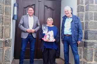 Der Erste Beigeordnete der Verbandsgemeinde Betzdorf-Gebhardshain, Joachim Brenner (li.) und Ortsbürgermeister Jürgen Giehl (re.) begrüßten Pfarrerin Kirsten Galla in Gebhardshain.