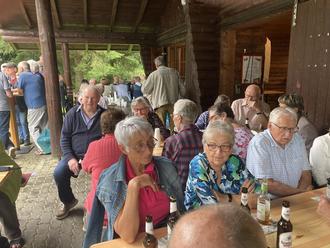 Dicht gedrängt saßen die Besucher und Besucherinnen in und vor der Grillhütte und suchten vor dem Regen Schutz.