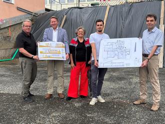 An der Baugrube, dem zukünftigen Standort des Anbaus (v. l.): Planer und Architekt Oliver Schmidt, Bürgermeister Joachim Brenner, Ortsbürgermeisterin Beate Straka, Josua Straka vom Bauamt und Bauamtsleiter Martin Schäfer stellen die geplanten Maßnahmen vor.