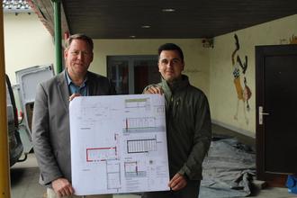 Bürgermeister Joachim Brenner (links) und Architekt Josua Straka (rechts) freuen sich über die nun begonnenen Baumaßnahmen an der Grundschule in Gebhardshain.