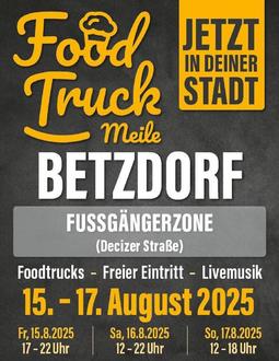 Das Warten hat ein Ende: Die beliebte Foodtruckmeile kommt erstmals nach Betzdorf. Mitten in der Fußgängerzone erwartet euch ein Wochenende voller Streetfood-Genüsse, cooler Drinks und Live-Musik – der perfekte Treffpunkt für alle Genießer, Musikfans und Familien.