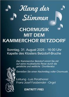 In der besonderen Atmosphäre der Kapelle des ehemaligen Klosters der Hl. Familie Betzdorf-Bruche lädt der Kammerchor Betzdorf am Sonntag, den 31. August 2025 um 16:00 Uhr zu einer Reise durch die geistliche und weltliche Chorliteratur ein.