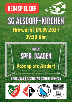 Die SG Alsdorf-Kirchen belegt nach drei Spieltagen aktuell mit sieben Punkten den 2. Tabellenplatz. Die Elf von Robin Stockschläder verbuchte bisher zwei Siege und ein Unentschieden. Nach diesem guten Saisonstart hofft die Heimmannschaft auf einen weiteren Dreier. Wir wünschen unserem Team ein gutes und erfolgreiches Spiel. Zudem freuen sich Spieler und auch der Verein auf einen großen Zuschauerzuspruch. Wir hoffen, den ein oder anderen beim Heimspiel in der Au begrüßen zu dürfen. Für das leibliche Wohl ist bestens gesorgt.