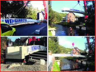 Am letzten Sonntag war es so weit: Der Betonkörper der neuen Rhenag-Brücke konnte eingebaut werden. Dazu war von morgens um 4 Uhr die Durchfahrt auf der L280 in diesem Bereich komplett gesperrt, mit einer Umfahrungsmöglichkeit über die Straße „Neuer Weg“. Nachdem der Betonkörper, der bei der Firma Wengeroth in Niederdreisbach hergestellt wurde, an der Baustelle eingetrofen war, trat ein Schwerlastkran der Firma Dornseifer in Aktion. Der nahm das 38t schwere Betonteil an den Haken und bugsierte es zielsicher an seinen neuen Platz. Das war Millimeterarbeit. Aber wie sich zeigte, hatten alle Beteiligten ihre Hausaufgaben sehr gut gemacht: es passte alles zusammen, so dass bereits vor 10 Uhr der Kran seine Arbeit verrichtet hatte. Nach Abbau des Krans und aller für den Einbau herbeigeschafften technischen Geräte konnte die Straße deutlich vor 16 Uhr, dem ursprünglich anvisierten Ende der Arbeiten, wieder für den Verkehr freigegeben werden.