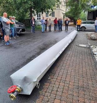 Philipp Rader von der Firma TURBOswiss aus der Schweiz referierte zunächst über ein neuartiges Hochwasserschutzsystem, bei dem mit Wasser gefüllte Schläuche wie ein Damm dem Hochwasser entgegen wirken. Dieses System ist binnen kürzester Zeit einsatzbereit und kann so großen Schaden verhindern. Im Anschluss an den Vortrag gab es für die Teilnehmerinnen und Teilnehmer auf dem Außengelände der Stadthalle eine Demonstration mit einem einfachen Damm der für Privatgebäude genutzt werden kann. In der Tat war der Damm binnen kürzester Zeit einsatzbereit - errichtet von nur einer Person.
