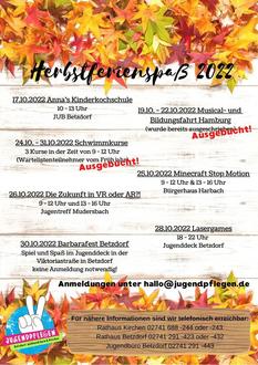 Auch in diesen Herbstferien gibt es wieder ein buntes Programm, um keine Langweile aufkommen zu lassen. Anmeldungen zu den Veranstaltungen nehmen wir unter hallo@jugendpflegen.de entgegen.