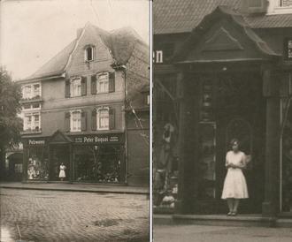 Hüte, Mützen, Schirme, Stöcke, Handschuhe, Crawatten [sic!], Wäsche, Pelzwaren. Diese Waren bot Peter Boquoi seiner Kundschaft laut Firmenschild an. Das imposante Haus war 1905 entstanden, als er seinen Hutverkauf mit dem Kauf des Grundstücks und dem Bau des neuen Geschäftshauses aufziehen wollte. Schräg gegenüber, an der Ecke zur Poststraße, residierte der „alte Boquoi“ (Vater?) mit seinem Obst- und Gemüseladen. Das Gebäude sah ursprünglich anders aus, es erhielt später ein weiteres Stockwerk. Der heute sichtbare Anbau nach rechts erfolgte in den späten 1950er Jahren.