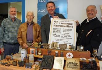 Beim Start der 25. Schmuck- und Mineralienbörse tauchte ein Plakat vom Ursprung im Jahr 1996 auf. Es staunten Organisator Konrad Schwan (von links), der damalige Bürgermeister Günter Schneider, Erster VG-Beigeordneter Joachim Brenner und Bergbaufreund Joachim Weger.