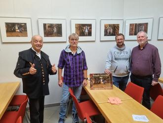 Nach der Eröffnung der 26. Schmuck- und Mineralienbörse und der Fotoausstellung "Bindweider Grubenmädels" präsentierten die Fotografen Bernd Rexhausen und Udo Runnebaum (2. und 3. von links) im Beisein der VG-Beigeordneten Joachim Weger (links) und Förderverein-Geschäftsführer Konrad Schwan den Fotokalender "Bindweider Grubenmädels 2025".