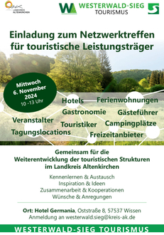 Der Westerwald-Sieg Tourismus der Kreisverwaltung Altenkirchen lädt alle Leistungsträger der Tourismusregion Westerwald-Sieg am 06.11.2024 zu einem touristischen Netzwerktreffen ins Hotel Germania in Wissen ein. Die Veranstaltung beginnt um 10.00 Uhr und soll vor allem dem Austausch zwischen Tourismus und den touristischen Leistungsträgern wie Gastronomie, Unterkunftsbetrieben und Anbietern sonstiger touristischer Dienstleistungen dienen. Neben einer kurzen Vorstellung der Arbeit des Westerwald Touristik-Service und des Westerwald-Sieg Tourismus erwartet die Teilnehmer im Rahmen eines gemütlichen Brunchs mit Fingerfood vor allem Raum für den individuellen Austausch untereinander und die Möglichkeit, gemeinsam an neuen Ideen zu feilen.