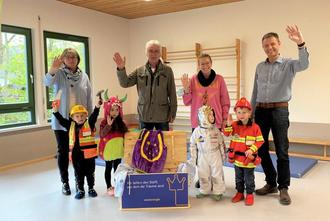Rudolf Staudt, Ortsbürgermeister von Alsdorf, und Peter Imhäuser, Leiter Kommunales Partnermanagement bei Westenergie in Siegen, freuten sich mit den Kleinen bei der Übergabe der Holzbox. „Eine tolle Überraschung der Westenergie zum Karnevalsauftakt. Da können die Kleinen direkt mitfeiern und sich verkleiden. Die Kostüme geben da einiges her“ freut sich Rudolf Staudt.