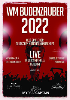 Dj Oaks sorgt vor und nach den Spielen für mächtig Stimmung beim Public Viewing. Los geht der WM-Budenzauber mit dem Vorrunden-Spiel gegen Japan am 23.11. um 14 Uhr. Die weiteren Partien sind am 27.11. um 20 Uhr gegen Spanien und am 01.12. um 20 Uhr gegen Costa Rica. Die Stadthalle öffnet bereits 2 Stunden vor Anpfiff die Türen zum Warm-Up.