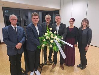 Nach den eindringlichen Worten der Referenten sowie den gefühlvollen Stücken von Meyer und Nazarenus, führte der Weg im Anschluss der Gedenkveranstaltung alle Anwesenden gemeinsam zur Gedenkrosette am Übergang zur Viktoriastraße. Symbolisch legten Stadtbürgermeister Geldsetzer und Horst Vetter mit Colin Haubrich, stellvertretend für die Grünen und die Jusos, Kränze nieder und hielten kurz inne.
