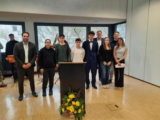 Stadtbürgermeister Behner und der Erste Beigeordnete der Verbandsgemeinde Greb mit den Schülerinnen und Schülern der Bertha-von-Suttner-Realschule plus