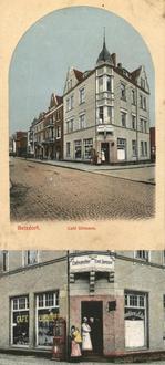 An der Wilhelmstraße konnte man seinerzeit im Café Ottmann seinen Kuchen genießen. Als Nachnutzer des 1900 eröffneten Kölner Konsums eröffnete Ottmann im Jahre 1912 seine Konditorei mit Café im markanten Eckhaus zum Klosterhof. Familie Ottmann ist auf dieser Auftragskarte werbewirksam im Eingangsbereich abgebildet. Im Obergeschoss, auf der Originalkarte zu erkennen, lehnt sogar Emil Jansen vom „Zahnatelier Jansen“ im geöffneten Fenster.