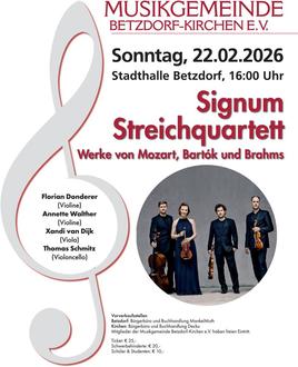 Am Sonntag, 22. Februar 2026, präsentiert die Musikgemeinde Betzdorf-Kirchen das „Signum Streichquartett“ um 16:00 Uhr in der Stadthalle Betzdorf.