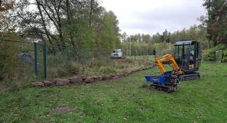Frühere Trockenlegungsversuche sind alle gescheitert, jetzt lassen wir der Natur freien Lauf und es entsteht am Rande der Wiesenfläche ein neues Biotop; nass war es ja schon immer, aber nun umrandet von zahlreichen Basalt- Findlingen. Durch die tatkräftige Unterstützung und unter Bereitstellung des eigenen Baggers sowie einer Motor- Schubkarre eines unserer Mitglieder, war es endlich möglich, eine natürlich anmutende Umrandung aus größeren Basalt- Findlingen zu erstellen. Vom Schwimmverein geplant ist, dieses neu erstellte Biotop-Areal, im Rahmen der weiteren Umwandlung und in Zusammenarbeit mit der lokalen Vertretung des Bundes für Naturschutz (NABU), auszugestalten und artgerecht zu bepflanzen.