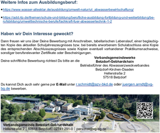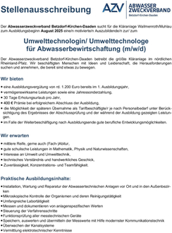 Stellenausschreibung: Ausbildung zur/zum Umwelttechnologin/ Umwelttechnologe für Abwasserbewirtschaftung (m/w/d)