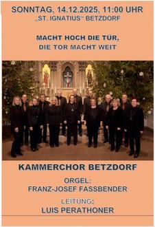 In der besinnlichen Atmosphäre des 3. Advents lädt der Kammerchor Betzdorf herzlich zu einem musikalisch gestalteten Gottesdienst ein. Am Sonntag, dem 14.12.2025, um 11:00 Uhr erfüllt der Klang des Chores die Kirche mit vorweihnachtlicher Wärme und Hoffnung. Unter der inspirierenden Leitung von Luis Perathoner und Franz Josef Faßbender an der Orgel präsentiert das dreizehnköpfige Ensemble ein fein abgestimmtes Programm, das Geist und Seele gleichermaßen berührt. Mit ergreifenden vier- und achtstimmigen Werken von Felix Mendelssohn Bartholdy, John Rutter und Lothar Graap möchte der Kammerchor eine Brücke zwischen Tradition und innerer Einkehr schlagen. Die Musik lädt dazu ein, den Alltag für einen Moment hinter sich zu lassen und sich von den Harmonien in eine vorweihnachtliche Stimmung tragen zu lassen - voller Hoffnung, Frieden und stiller Erwartung. Darüber hinaus richtet der Kammerchor Betzdorf den Blick bereits auf einen weiteren musikalischen Höhepunkt des neuen Jahres: Das traditionelle Neujahrskonzert mit renommierten Solisten findet am Sonntag, dem 11.01.2026, um 16:00 Uhr in der stimmungsvollen Klosterkapelle des Klosters Bruche statt. Auch zu diesem Anlass sind alle Musikliebhaberinnen und Musikliebhaber herzlich eingeladen, sich vom Zauber der Chormusik mitreißen zu lassen und gemeinsam einen klangvollen Jahresauftakt zu erleben. Der Kammerchor Betzdorf freut sich darauf, die Besucherinnen und Besucher mit Musik und Emotion zu beschenken - ein Lichtstrahl in der dunklen Jahreszeit und ein wohltuender Auftakt zu den kommenden Feiertagen.