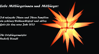 In diesem Sinne wünsche ich Ihnen allen und Ihren Familien ein friedliches und segensreiches Weihnachtsfest sowie für das neue Jahr 2023 Gesundheit, Frieden und ihr ganz persönliches Glück, zu dem für die meisten Menschen neben der Familie auch das Wohlfühlen in ihrer Gemeinde zählt - dazu können wir alle beitragen. Mögen Ihre persönlichen Wünsche alle in Erfüllung gehen.