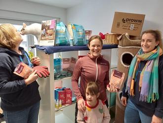 Eine Futterspende von der Firma Prowin, überreicht durch Claudia Schwarz, bekamen kürzlich die Tierheimtiere in Weitefeld. Sie brachte den Fellnasen einen prall gefüllten Karton mit vier Spendenpaketen im Wert von 500 Euro mit. Viele tolle Leckerchen, Futter, Sprays und Handschuhe zur Fellpflege fanden so den Weg in die Tierauffangstation. Ein herzliches Dankeschön für den Besuch und den mitgebrachten Spenden ging an Claudia Schwarz (Bildmitte). Geschäftsführerin Daniela Spies-Rübsamen (rechts) und 2. Vorsitzende Michaela Rohn konnten die Leckerchen direkt an Kater Spunk testen.