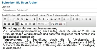 Im Bereich "Überschrift" bitte den Vereinsnamen eintragen. Im darunterliegenden Textbereich bitte zunächst eine Überschrift in fett nennen. Im Anschluss daran bitte die Tagesordnungspunkte (durch Semikolon voneinander getrennt) als Fließtext einfügen.