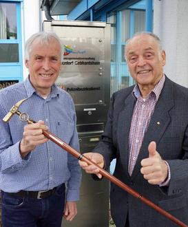“Eine gelungene Überraschung“, freute sich nun Dr. Joachim Schwarz aus Dickendorf (links), Präsident des Deutschen Heilstollenverbandes, über die Ernennung „Steiger ehrenhalber“. Als bergbauliches Symbol der Anerkennung überreichte Joachim Weger, Beigeordneter der Verbandsgemeinde Betzdorf-Gebhardshain, einen Siegerländer Häckel.