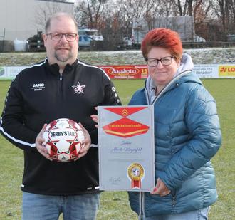 Frau Alberts-Wingenfeld von der Löwen-Apotheke hat die Patenschaft übers "Togehter-Team" übernommen. Mario Sahm bedanket sich dafür im Namen der JSG Siegtal/Heller