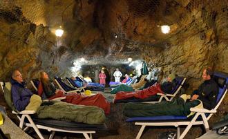 2. Im Heilstollen ist es sehr ruhig. Tatsächlich liegt der Schallpegel während der meisten Zeit unter 10 Dezibel. Diese „Lautstärke“ ist so leise, dass sie selbst mit sehr empfindlichen Mikrophonen kaum noch wahrgenommen werden kann. Ab und zu tropft ein Wassertropfen auf den Schlafsack - ein sehr lautes Geräusch im Stollen!
