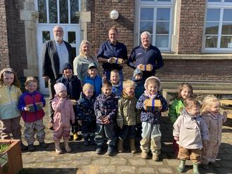 Über die wunderschöne Überraschung freuen sich mit den Kita-Kindern, die Mitarbeiter der Firma Muhr und Bender, Michael Lenz und, Kita-Leitung Brita Comisel, sowie Stadtbürgermeister Walter Strunk.