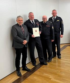 von links nach rechts: Bürgermeister Helmut Stühn, André Fries, Wehrleiter Matthias Theis, Brand- und Katastrophenschutzinspekteur Ralf Schwarzbach