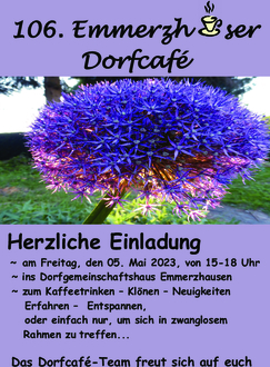Nach über drei Jahren Unterbrechung findet am Freitag, den 5. Mai, ab 15 Uhr wieder ein Emmerzhäuser Dorfcafé statt. Wir wollen von nun an wieder an jedem ersten Freitag im Monat einen Treffpunkt für Jung und Alt anbieten. Wir freuen uns auf ein Wiedersehen.