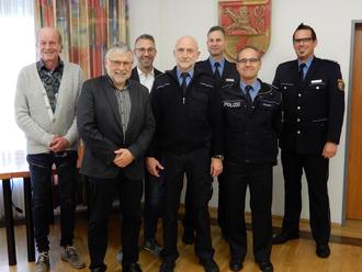 In einer kleinen Feierstunde wurde jetzt der Bezirksdienstbeamte Matthias Alt (Bildmitte) im Daadener Rathaus von Bürgermeister Helmut Stühn verabschiedet. Seit Mai 2020 war Alt örtlicher Ansprechpartner der Polizei in Daaden, hat deren sichtbare Präsenz erhöht und stand in engem Kontakt mit der hiesigen Örtlichen Ordnungsbehörde. Der Bürgermeister bedankte sich für eine immer hervorragende Zusammenarbeit. Er hob das Engagement des Bezirksbeamten hervor und das hohe Maß an Akzeptanz, die dieser in der Bevölkerung der Alt-Verbandsgemeinde genoss. Gleichzeitig begrüßte er Frank Höllerer (2. von rechts), der die Nachfolge von Matthias Alt antritt und seit Jahresbeginn das neue Gesicht der Polizei bei der Verbandsgemeindeverwaltung ist. Erreichbar ist er - vorbehaltlich anderer Termine und Einsätze - in der Regel während der Öffnungszeiten der Verwaltung. Der Verwaltungschef wünschte ihm für seinen neuen Tätigkeitsbereich viel Erfolg. Marcus Franke, Leiter der Polizeiinspektion Betzdorf und sein Stellvertreter Mario Sedello waren aus Anlass der Verabschiedung nach Daaden gekommen und fanden ebenfalls lobende Worte für Matthias Alt wie auch Büroleiter Pascal Weyand und Peter Wallmeroth, stellvertretender Leiter des Fachbereichs Bürgerdienste.