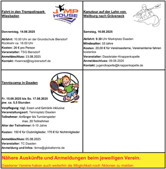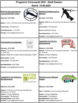Die Stadt Daaden bietet in Kooperation mit der TSG Biersdorf, der Daadetaler Knappenkapelle und dem Tennisclub Daaden mit Fahrten ins Fort Fun Abenteuerland, zur Freilichtbühne Freudenberg, zum Kletterwald, ins Jumphouse nach Wiesbaden, zum Wakeboard- und Wasserpark nach Marburg und einer Kanutour auf der Lahn sowie einem Röhnrad Schnuppertag und einem Tenniscamp ein interessantes und abwechslungsreiches Programm an.